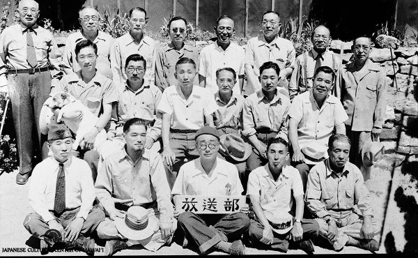 "Broadcast Department" members, Santa Fe Internment Camp, ca. 1944-1945. Bottom row (L-R): Masayuki Chikuma (2nd), Shigeru Yano (3rd), Shigeki Mizumoto (4th), Yuichi Nakaichi (5th). Middle row: Minoru Murakami (2nd), Genpachi Tsushima (3rd), Kumaji Furuya (6th). Top row: Toramatsu Matsumoto (1st), Rev. Yutetsu Matsui (3rd), Totaro Matsui (4th), Rev. Kodo Fujitani (5th). JCCH/Pat Saiki Archival Collection.