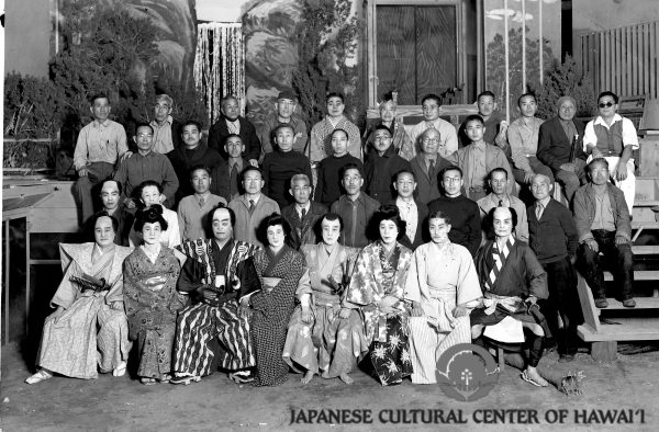 Kabuki at Santa Fe Internment Camp. Row 2 (L-R): Sawajiro Ozaki (4th). Row 3: Tsuneichi Yamamoto (1st), Masayuki Chikuma (2nd), Shigeki Mizumoto (3rd), Genpachi Tsushima (4th), Shoho Fujiie (5th), Shigeru Yano (6th), Katsuichi Kawamoto (7th). Back row: Zenkichi Morita (1st), Kiyoshi James Yonemura (5th). JCCH/Matsumoto-Tsushima Family Collection.
