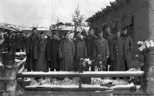 Winter, Santa Fe Internment Camp, New Mexico. Rentaro Degawa (second from left) and Kunitaro Takeuchi (third from right). JCCH/Amy Inowe.