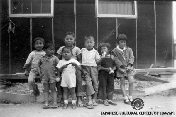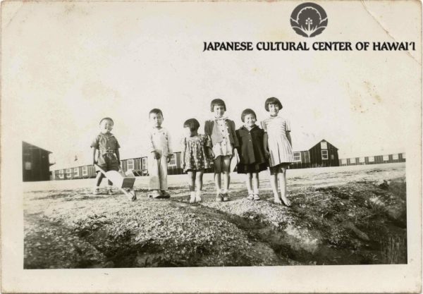 Jerome Concentration Camp. L-R: Yukie Fujimoto, Naoe Naitoh, Gladys Naitoh, unknown adult, Gilbert Fujimoto, Hisashi Fujimoto, Rev. Kyodo Naitoh. JCCH/Gladys Naitoh Archival Collection.