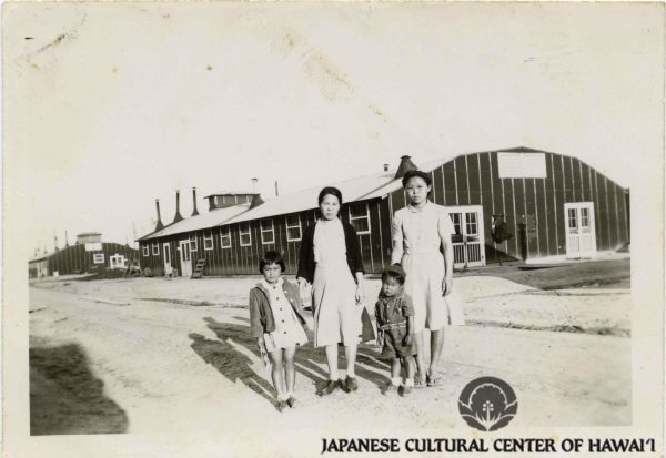 Naitoh family in front of mess hall, Jerome Concentration Camp. L-R: Gladys Naitoh, Gilbert Fujimoto, Naoe Naitoh, Rev. Kyojo Naitoh. JCCH/Gladys Naitoh Archival Collection.