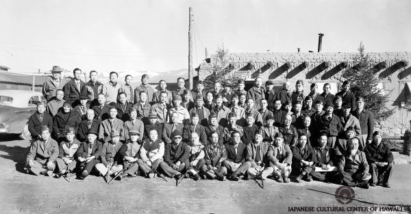 Hawaii internees in front of the Liaison Office at the Santa Fe Internment Camp, New Mexico, January 1945. Front row (L-R): Kumaji Furuya, Shujiro Takakuwa, Mankichi Goto, Chosuke Kayahara, Suekichi Oka, Nisshu Kobayashi, Shuji Mikami, Sadasuke Hamamoto, Konin Matano, Isaku Orita, Makitaro Tamura, Minosuke Hanabusa, Giichi Sasaki, Ryosen Yonahara, Tomiji Kimura, Ninryo Nago, Shin Yoshida. Row 2: Katsuichi Tanaka, Yasuemon Miki, Ryoichi Tanaka, Hatsutaro Toyofuku, Toshio Iinuma, Masaichi Hirashima, Tamaichi Tanaka, Uemon Ida, Kinai Ikuma, Hanzo Shimoda, Yoshizo Ishikawa, William Toka Ida, Katsuichi Kawamoto, Daizo Sumida, Aisuke Shigekuni, Sadato Morifuji. Row 3: Takegoro Kusao, Setsuzo Toyota, Jinshichi Tokairin, Hidekichi Nakamoto, Gendo Okawa, Joei Oi, Yasutaro Soga, Zensuke Kurosawa, Tsunetaro Harada, Tamaki Arita, Hego Fuchino, Kogan Yoshizumi, Osuke Shigemoto, Hakuai Oda, Shinri Sarashina, Yoshinobu Sasaki, Unknown, Seiichi Fujii, Tokikichi Sugimoto, Shuntaro Ikezawa, Goki Tatsuguchi, Suekuma Takaki. Back row: Unknown, Suijo Kabashima, Koichi Iida, Sawajiro Ozaki, Shoho Fujiie, Unknown, Shigeki Mizumoto, Soichi Obata, Muneo Kimura, Yukihide Kohatsu, Tomoichi Hayashi, Kakujiro Nishiki, Takeo Miyagi, Josen Deme, Gikyo Kuchiba, Eita Sato, Ryuichi Kashima, Hideyuki Serizawa, Kinzo Sayegusa. JCCH/Rev. Hakuai Oda Collection.