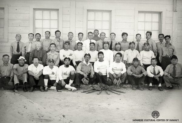 Hawaii softball team at the Fort Missoula Internment Camp, Montana, 1943. Front row (L-R): Tomoichi Hayashi, Ryuichi Kashima, Kazumi Matsumoto, Shujiro Takakuwa. Row 2: Masayuki Iwata, Kumaji Furuya, Goki Tatsuguchi, Yoshinobu Sasaki, Masahiro Himeno. Back row: Soichi Obata, Akio Kimura, Isaku Orita, Tamaki Arita, Masato Kiyosaki, Suijo Kabashima. JCCH/Soichi Obata Archival Collection.