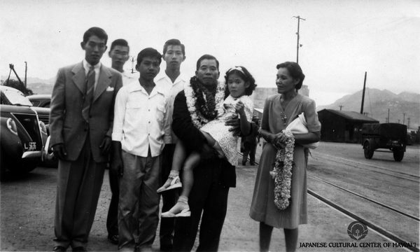Kumaji Furuya being greeted by his family upon his return to Honolulu after four years in mainland internment camps, November 1945. L to R: Hanzo, Seizo, Albert Tomochi, Robert Keiichi, Kumaji Furuya carrying Florence Yoko, wife Jun. JCCH/ Gregg Furuya Collection