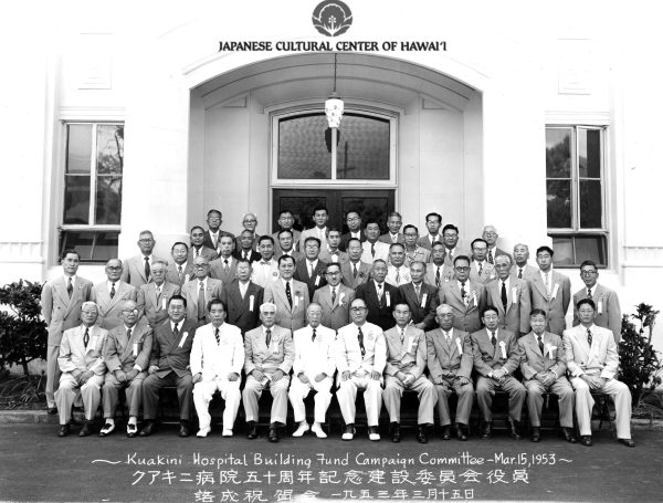 Kuakini Hospital Building Fund Committee. Honolulu, March 1953. Row 1 (seated, L-R): Tokuji Tsuji (1st), Katsuichi Kawamoto (2nd), Kumaji Furuya (4th), Chomatsu Tsukiyama (5th), Daizo Sumida (6th), Tokuyoshi Awamura (8th), Shigeru Horita (9th). Row 2: Clarence Keiso Karimoto (1st), Masayuki Tokioka (2nd), Motohiro Tanimura (6th), Mannosuke Komu (11th). Row 3: Katsuichi Wakimoto (3rd), Sawajiro Ozaki (5th), Tsuneichi Yamamoto (6th). Row 4: Takeo Isoshima (4th), Shinzaburo Sumida (6th), Katsuro Miho (7th). Row 5: Osuke Shigemoto (1st), Robert Yoichi Sato (4th). JCCH/ Takuzo Kawamoto Collection.