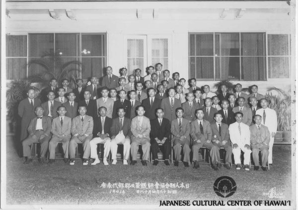United Japanese Society, April 1941. Row 1 (seated, L-R): Totaro Matsui (2nd), Osuke Shigemoto (4th), Kumaji Furuya (5th), Taichi Sato (7th), Koichi Iida (9th), Kyoichi Miyata (12th). Row 2: Yasutaka Fukushima (5th), Sawajiro Ozaki (9th), Sadasuke Terasaki (13th). Row 3: Isoto Dewa (3rd). Row 5: Ryuten Kashiwa (2nd from R). JCCH/ Harriet Masunaga Collection.