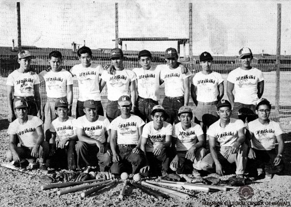 Kitchen workers' softball club, "Waikiki", at Topaz Concentration Camp, ca. 1943. Bottom Row (L-R): Kozen Nakama, Mijo, Shiroma [Mainlander], Hideo Kaneshiro, Yoshitsune Gushiken, Koichi Oshiro, Shigeru Kaneshiro, Seijun Tamashiro. Top Row: Seikichi Takushi, Soko Yaka, Unknown, Tamanaha [Mainlander], Juchin Arakaki, Higa, Unknown. JCCH/Hideo Kaneshiro Collection.