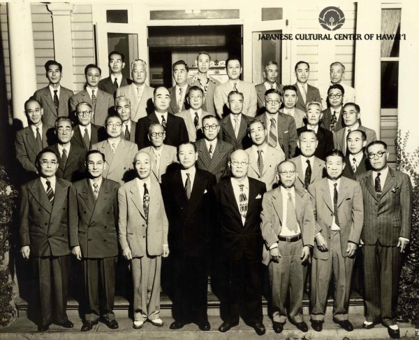 Honolulu businessmen, ca. 1950. Front Row (L-R): Matsujiro Otani (1st), Taichi Sato (2nd), Sadato Morifuji (3rd), Katsuichi Kawamoto (5th), Nekketsu Takei (6th), Soichi Obata (8th). Row 2: Seiichi Shimamoto (5th). Row 3: Manzuchi Hashimoto (6th), Ozuke Shigemoto (7th). Back Row: Katsuichi Wakimoto (6th), Motohiro Tanimura (7th), Yuichi Nakaichi (10th). JCCH/ Charles and Claire Richardson Collection.