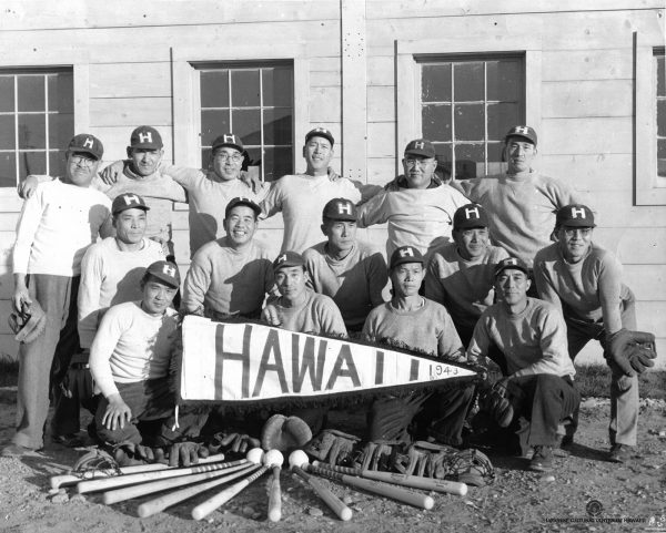 Hawaii softball team at the Fort Missoula Internment Camp, Montana, 1943. Front row (L-R): Tomoichi Hayashi, Ryuichi Kashima, Kazumi Matsumoto, Shujiro Takakuwa. Row 2: Masayuki Iwata, Kumaji Furuya, Goki Tatsuguchi, Yoshinobu Sasaki, Masahiro Himeno. Back row: Soichi Obata, Akio Kimura, Isaku Orita, Tamaki Arita, Masato Kiyosaki, Suijo Kabashima. JCCH/Soichi Obata Archival Collection.