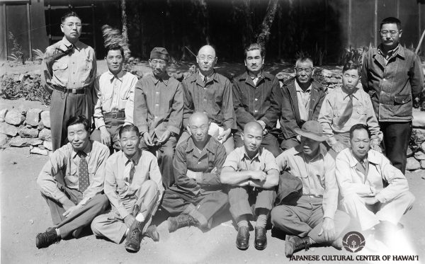 Hawaii Tenrikyo ministers with bishop of the Tenrikyo American Mission. Santa Fe Internment Camp. Front Row (L-R): Sunao Fujii (1st), Ichiro Genishi (2nd), Rev. Hidekichi Nakamoto (1st from R). Back Row (L-R): Rev. Naoichi Seto (1st), Rev. Masayuki Iwata (2nd), Rev. Sakujiro Ueno (3rd), American Mission Bishop Masaharu Hashimoto (4th), Rev. Kaneki Honda (5th), Osuke Shigemoto (2nd from right). JCCH/Sunao Fujii Archival Collection.