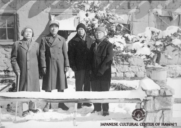 Santa Fe Internment Camp. L-R: Matsujiro Otani (1st), Riuichi Ipponsugi (3rd), Yasutaro Soga (4th). JCCH/Riuichi Ipponsugi Archival Collection.