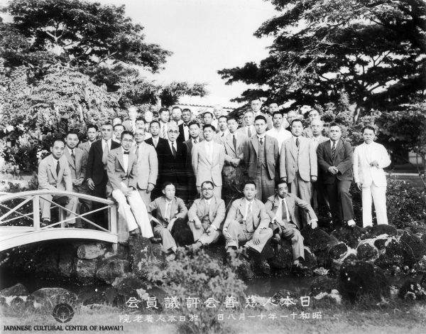 Japanese Benevolent Society, council members. November 1936. Riuichi Ipponsugi (2nd from L, on bridge), Taichi Sato (7th from L, standing in dark suit, dark hair), Iga Mori (8th from L, dark suit, white hair, glasses), Yasutaro Soga (3rd from R, standing), Daizo Sumida (4th from R, standing), Katsuichi Wakimoto (behind Sumida with white shirt). JCCH/ Harriet Matsunaga Collection.