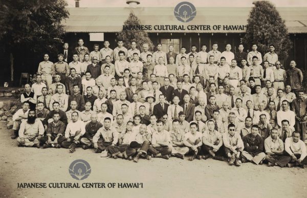 Internees from Kauai at the Santa Fe Internment Camp, New Mexico, June 1943 - March 1944. Front row (L-R): Setsugo Togioka (2nd), Koshi Tatsuhara (3rd), Isami Ueoka (4th), Osuke Shigemoto (5th), Torao Iseri (8th), Rev. Ichiro Uyeda (9th). Row 2: Rev. Kakichi Okamoto (1st), Rev. Takao Ama (2nd), Kyoichi Uyeda (3rd), Zenkichi Morita (5th), Ikuzo Kuniyuki (6th), Kenichi Hataishi (8th), Kazuto Taketa (9th). Row 3: Sunao Fujii (1st), Mankichi Miura (2nd), Kazuto Yokota (3rd), Takeo Seike (4th), Masaji Toyofuku (5th), Shinjiro Matayoshi (6th), Shizuma Tanji (7th), Rev. Kakuho Asaoka (8th), Yonezo Kanja (9th), Zenzo Kisada (10th), Ishimatsu Shintani (11th). Back row: Junzo Mashita (3rd), Jukichi Inouye (5th), Kenji Yoshiura (6th), Kazumi Matsumoto (9th), Gengo Honda (10th). JCCH/Sunao Fujii Archival Collection.