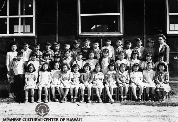 Elementary school group, Tule Lake Segregation Center, August 1945. Hiroko Iwashita, first row, third from left. JCCH/Iwashita Family Collection.