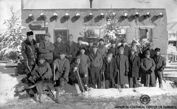 Hawaii internees in front of the Liaison Office at the Santa Fe Internment Camp, New Mexico, January 1945. Front row (L-R): Kumaji Furuya, Shujiro Takakuwa, Mankichi Goto, Chosuke Kayahara, Suekichi Oka, Nisshu Kobayashi, Shuji Mikami, Sadasuke Hamamoto, Konin Matano, Isaku Orita, Makitaro Tamura, Minosuke Hanabusa, Giichi Sasaki, Ryosen Yonahara, Tomiji Kimura, Ninryo Nago, Shin Yoshida. Row 2: Katsuichi Tanaka, Yasuemon Miki, Ryoichi Tanaka, Hatsutaro Toyofuku, Toshio Iinuma, Masaichi Hirashima, Tamaichi Tanaka, Uemon Ida, Kinai Ikuma, Hanzo Shimoda, Yoshizo Ishikawa, William Toka Ida, Katsuichi Kawamoto, Daizo Sumida, Aisuke Shigekuni, Sadato Morifuji. Row 3: Takegoro Kusao, Setsuzo Toyota, Jinshichi Tokairin, Hidekichi Nakamoto, Gendo Okawa, Joei Oi, Yasutaro Soga, Zensuke Kurosawa, Tsunetaro Harada, Tamaki Arita, Hego Fuchino, Kogan Yoshizumi, Osuke Shigemoto, Hakuai Oda, Shinri Sarashina, Yoshinobu Sasaki, Unknown, Seiichi Fujii, Tokikichi Sugimoto, Shuntaro Ikezawa, Goki Tatsuguchi, Suekuma Takaki. Back row: Unknown, Suijo Kabashima, Koichi Iida, Sawajiro Ozaki, Shoho Fujiie, Unknown, Shigeki Mizumoto, Soichi Obata, Muneo Kimura, Yukihide Kohatsu, Tomoichi Hayashi, Kakujiro Nishiki, Takeo Miyagi, Josen Deme, Gikyo Kuchiba, Eita Sato, Ryuichi Kashima, Hideyuki Serizawa, Kinzo Sayegusa. JCCH/Rev. Hakuai Oda Collection.