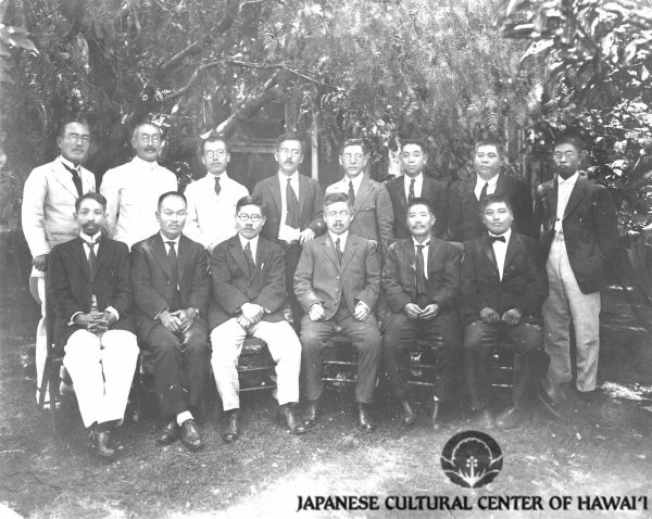 Maui Nikkei Community Members. ca. 1925. Front Row (L-R): Gunsuke Yasui (1st), Katsuichi Kawamoto (2nd), Dr. Seiichi Ohata (3rd), Dr. Koshiro Tofukuji (4th), Hisahi Ito (5th or 6th). Back Row: Nagao Otsuka (2nd), Miyamoto (3rd), Dr. Yukihide Kohatsu (4th), Jiro Fujiyoshi (5th), Tomoeda (6th), Yasujiro Matsuda, Dr. Kohatsu's driver (7th), Matsuzo Kozaki (8th). JCCH/ Takuzo Kawamoto Collection.