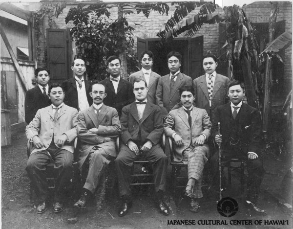Organizers of 1st Labor Strike on Oahu, ca. 1909. 1st Row (L-R): Matsutaro Yamashiro (1st), Yasutaro Soga (2nd), Kinzaburo Makino (3rd), Motoyuki Negoro (4th), Yokichi Tasaka (5th). 2nd Row: Yasuyuki Imai (1st), Tsurumatsu Okumura (2nd), Katsuichi Kawamoto (3rd), Hidekichi Takemura (4th), Keitaro Kawamura (5th), Shuichi Ihara (6th). JCCH/ Takuzo Kawamoto Collection.