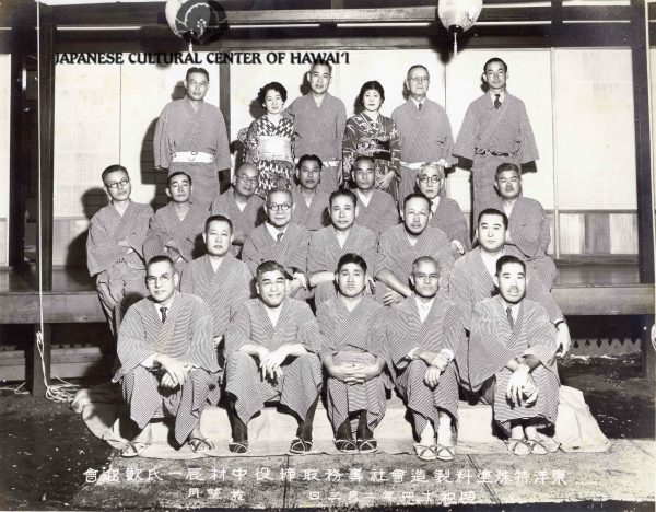 Welcome Reception for Tatsuichi Nakamura of the Toyo Paint Manufacturing Company at Mochizuki Teahouse, Honolulu, 1939. Row 2 (L-R): Daizo Sumida (1st), Seiichi Tsuchiya (4th). Row 3: Katsuichi Kawamoto (3rd), Katsuichi Wakimoto (4th). JCCH/Seiichi Tsuchiya and Fred Kinzaburo Makino Collection.