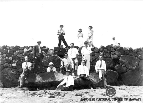 Big Island photographers. City of Refuge, Kona, Hawaii Island, 1937. 1st row, seated: Kenichi Maehara (white hat); Kumaichi Fukuba (1st from R). Back Row: Takeshi Kanemori (1st from L). Fukuba, Maehara, and the parents of Kanemori, Shinroku and Fujino Kanemori, were incarcerated during the war. JCCH/Richard Sakihara Collection.