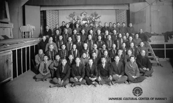 Buddhist priests from Hawaii. Santa Fe Internment Camp, April 1944. Bottom row (L-R): Rev. Kogan Yoshizumi, Rev. Hozui Nakayama, Rev. Shinri Sarashina, Rev. Enryo Shigefuji (Fresno, Calif.), Bishop Ninryo Nago, Rev. Chikyoku Kikuchi, Rev. Shutetsu Uyenoyama, Rev. Konin Matano, Rev. Yutetsu Matsui, unknown, unknown, Rev. Doro Kanda. Middle row (L-R): Rev. Dojin Ochi (Los Angeles), Rev. Ryuko Tachibana (Los Angeles, formerly of Hawaii), Rev. Daishin Ikejiri, Rev. Gendo Okawa, Rev. Suijo Kabashima, Rev. Tenran Mori, unknown, Rev. Ryuten Kashiwa, Rev. Josen Deme, Rev. Hakuai Oda, Rev. Taizen Imamura, Rev. Hosho Kurohira, Rev. Shunjo Shiratori, Rev. Bunpo Kuwatsuki (Los Angeles), unknown, Rev. Shodo Kawamura. Top row (L-R): Rev. Zenkai Tatsuguchi, Rev. Jikai Yamasato, Rev. Kenryu Hasegawa, unknown, Rev. Kenju Ohtomo, unknown, Rev. Gikyo Kuchiba, Zenko Saigusa, Rev. Kodo Fujitani, Rev. Kenjo Ohara, Rev. Giko Abiko (Calif.), Rev. Nisshu Kobayashi, unknown. JCCH/Rev. Hakuai Oda Collection.