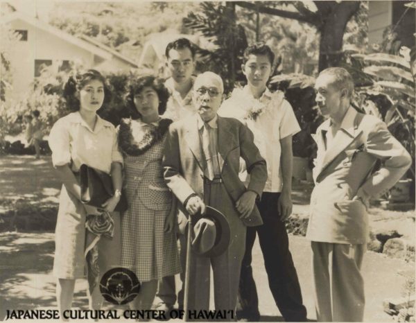 June 1922. L-R: Dr. Iga Mori (father of Motokazu), Yaye Mori (mother of Motokazu), Dr. Tasuku Harada (University of Hawaii professor), Dr. Tomizo Katsunuma (veterinarian), Hachiro Kishi, Dr. Motokazu Mori, Misao Harada Mori (first wife of Motokazu). JCCH/ Victor Mori Archival Collection.