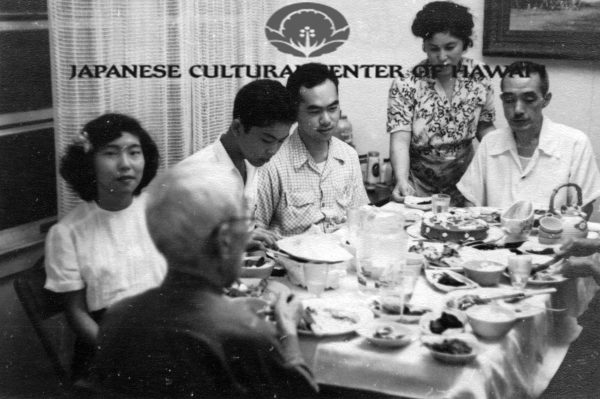 The Mori family postwar, reunited at home in Nu'uanu, Oahu Island, after incarceration, ca. 1945. Clockwise from left: Iga Mori (back to camera), Pearl Mori, Ramsey Mori, Victor Mori, Ishiko Mori, and Motokazu Mori. Iga Mori is the father of Motokazu Mori; Pearl, Ramsey, and Victor are the children of Motokazu and Ishiko Mori. JCCH/Victor Mori Archival Collection.