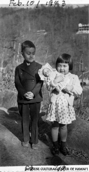 Thomas Ryoju Okano, age 5, and sister, Grace Mayumi, age 4. Before leaving for Crystal City Internment Camp, February 1943. JCCH/Thomas Okano Collection.