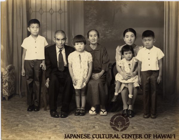 Photograph of Otokichi Ozaki's family, taken in Honolulu, 1942, to send to him in the internment camp. L-R: Son Earl Tomoyuki, father Tomoya, daughter Alice Sachi, mother Shobu, wife Hideko, daughter Lily Yuri, son Carl Yukio. JCCH/Otokichi Ozaki Archival Collection.