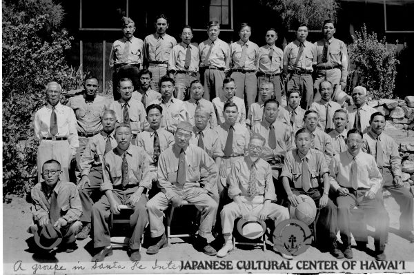 Internees from Oahu. Santa Fe Internment Camp, 1944. Front row (L-R): Rev. Kogan Yoshizumi (3rd), Ryoichi Tanaka (5th), Nekketsu Takei (8th). Row 2: Mamoru Suga (2nd), Kazuyuki Kawano (3rd), Mannosuke Komu (5th), Masaichi Kobayashi (6th). JCCH/Joan Oya Collection.