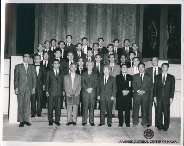 Kuakini Hospital Building Fund Committee. Honolulu, March 1953. Row 1 (seated, L-R): Tokuji Tsuji (1st), Katsuichi Kawamoto (2nd), Kumaji Furuya (4th), Chomatsu Tsukiyama (5th), Daizo Sumida (6th), Tokuyoshi Awamura (8th), Shigeru Horita (9th). Row 2: Clarence Keiso Karimoto (1st), Masayuki Tokioka (2nd), Motohiro Tanimura (6th), Mannosuke Komu (11th). Row 3: Katsuichi Wakimoto (3rd), Sawajiro Ozaki (5th), Tsuneichi Yamamoto (6th). Row 4: Takeo Isoshima (4th), Shinzaburo Sumida (6th), Katsuro Miho (7th). Row 5: Osuke Shigemoto (1st), Robert Yoichi Sato (4th). JCCH/ Takuzo Kawamoto Collection.