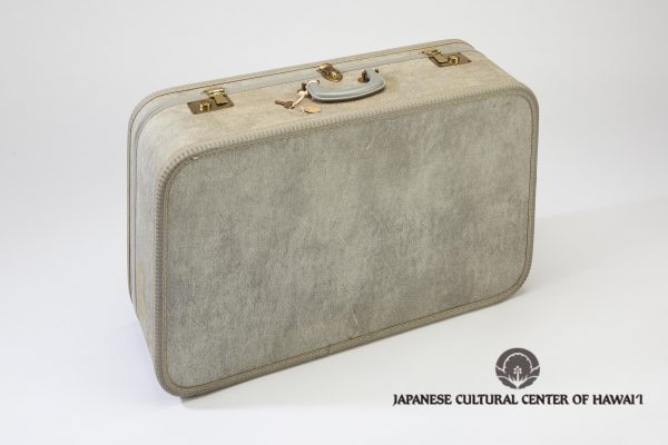 Grey suitcase with key and tag attached, used by Haruko Takahashi during incarceration. JCCH/Takahashi Family Collection.