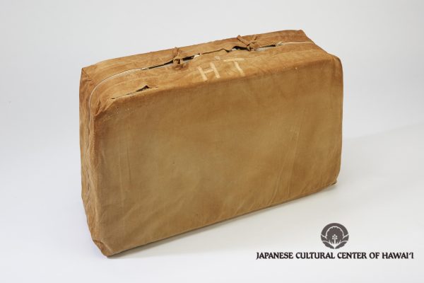 Hand sewn suitcase cover with zipper and initials "HT" stitched with grosgrain by Haruko Takahashi during incarceration, c. 1943-1944. JCCH/Takahashi Family Collection.
