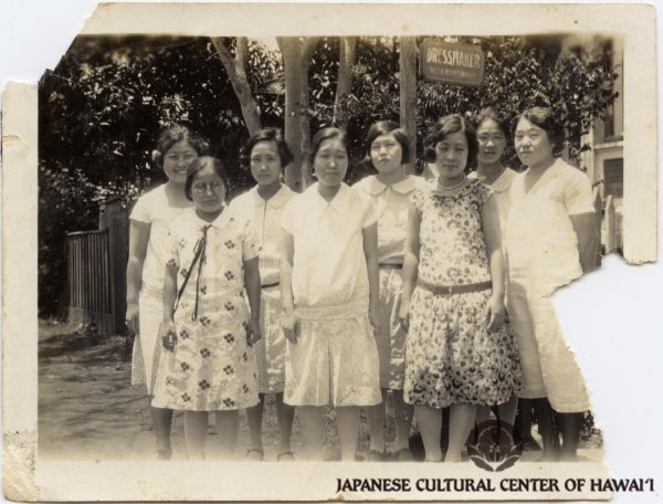 Dressmaking class, ca. 1927. Haruko Takahashi, age 17, second from left. JCCH/Konko Mission of Wahiawa Collection.