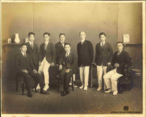 Nippu Jiji newspaper staff, Honolulu, ca. 1920. Shigeichi Kawamura (3rd from L), publisher Yasutaro Soga (3rd from R), editor Shoichi Asami (1st from right). JCCH/Betsy Anne Kawamura Collection.