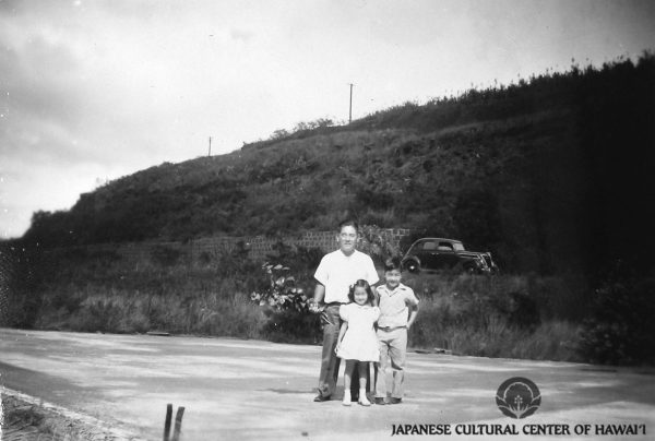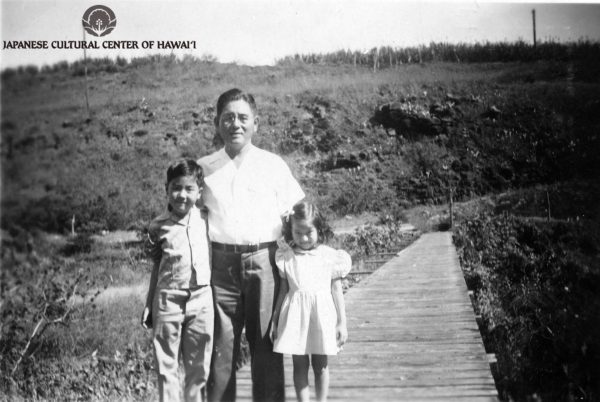 Hashimoto Family standing on aqueduct, Honouliuli Internment Camp, 1948. David Hashimoto (son), Koji Hashimoto (internee), Elsie Hashimoto (daughter). English translation of writing on back of photograph: "This is where I was interned for over one year during the war. This bridge was called 'Hell's Bridge.' Many hundreds of internees cried as they crossed this bridge. When I recall it now, I am filled with deep emotion." JCCH/Hashimoto Family Collection.
