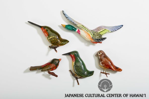 Five hand-painted wooden birds carved by Meijiro Hayashi at Honouliuli Internment Camp. JCCH/Hayashi Meijiro Collection.