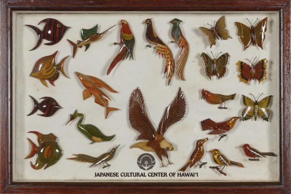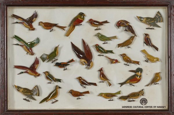 Collection of carved and painted birds, fish and butterflies, made in Jerome, Arkansas by Yukuma Hayashi. JCCH/Yukuma Hayashi Collection.