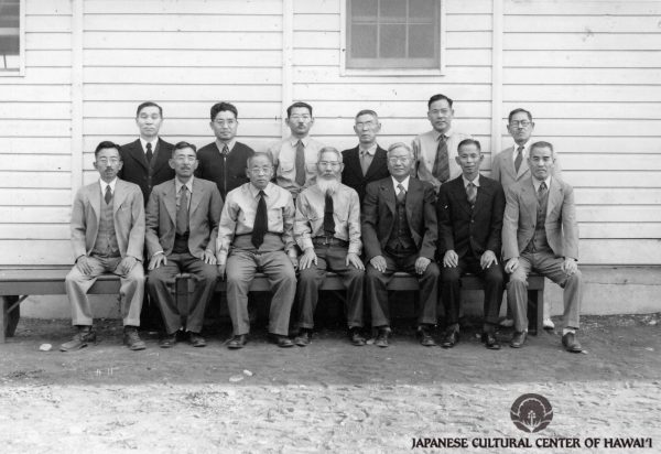 Liaison Office, Santa Fe Internment Camp. Front Row (L-R): Rev. Yutetsu Matsui (4th). Back row (L-R): Rev. Shodo Kawamura (1st), Rev. Taizen Imamura (3rd), Kosuke Hirose (6th), Haruo Koike (11th). JCCH/Meiji Hirose Collection.