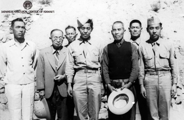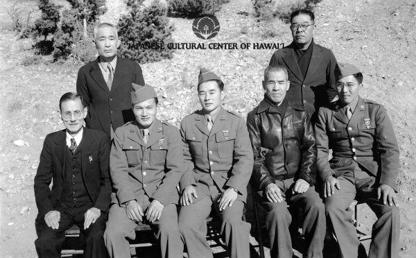 Internees with visiting Japanese American soldiers. Front Row (L-R): Rev. Yutetsu Matsui (1st), Kingo Hayashi, son-in-law of Kosuke Hirose (3rd), Kosuke Hirose (4th). 2nd Row: Soichi Obata (2nd). Santa Fe Internment Camp. JCCH/Meiji Hirose Collection.
