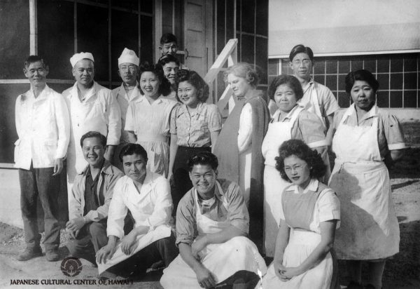 Hospital kitchen staff, Jerome Concentration Camp. Kneeling (L-R): Haruto Harold Itoh (1st), Shizuo Yoshikane (2nd). Standing: Masuo Niki (2nd from left). JCCH/Shizuo Yoshikane.