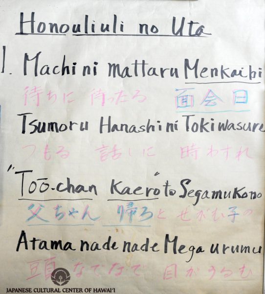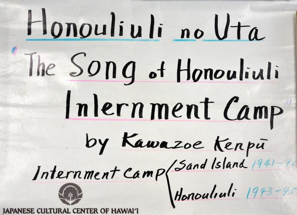 Cover page of "Honouliuli no uta" [“Song of Honouliuli”], by Kenpu Kawazoe, handwritten on back of a calendar. Kawazoe wrote this song to tell his family about his internment at Honouliuli. JCCH/Shozo Takahashi Collection.