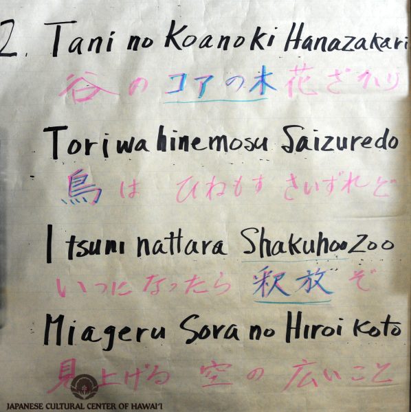 First verse of "Honouliuli no uta" [“Song of Honouliuli”], by Kenpu Kawazoe, handwritten in Japanese on the back of a calendar. Kawazoe wrote this song to tell his family about his internment at Honouliuli. JCCH/Shozo Takahashi Collection.