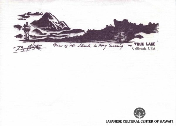 Kyojo Naitoh. "View of Mt. Shasta in May Evening '44, Tule Lake, California USA," woodblock print stationary. JCCH/Gladys Naitoh Archival Collection.