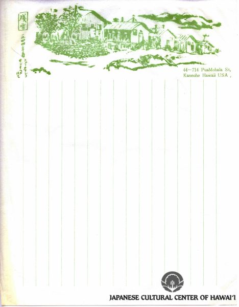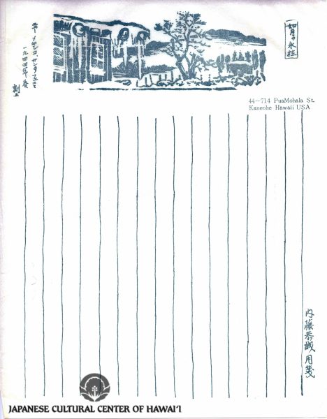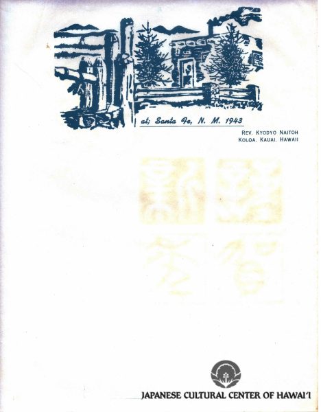 Kyojo Naitoh. "at; Santa Fe, N.M. 1943, Rev. Kyodyo Naitoh, Koloa, Kauai, Hawaii," woodblock print stationary. JCCH/Gladys Naitoh Archival Collection.