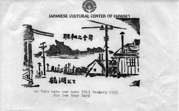 Kyojo Naitoh. New Years card woodblock print of Tule Lake barracks, January 1945. JCCH/Patsy Saiki Archival Collection.