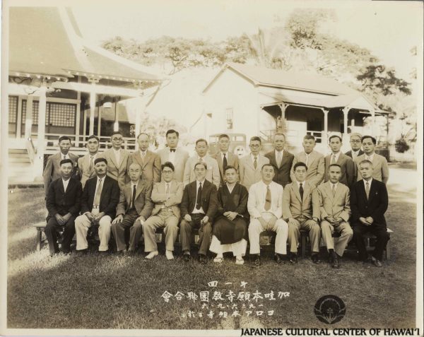 First meeting of Kauai Hongwanji missions. Koloa, Kauai Island, September 1936. Rev. Kyojo Naitoh (front row, 6th from L), Rev. Honi Ohye (1st row, 7th from L). JCCH/Gladys Naitoh Archival Collection.