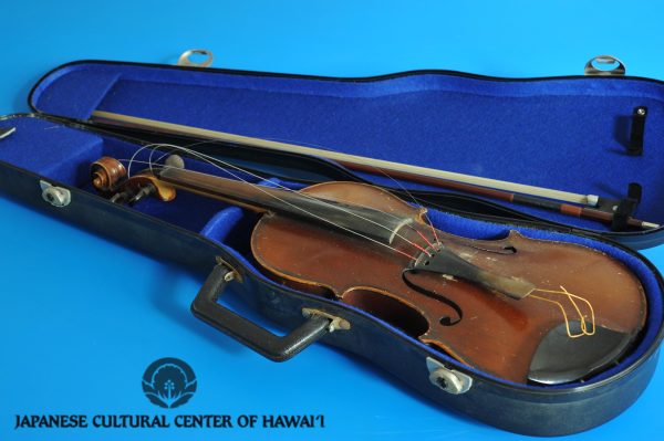 Violin with bow in case belonging to Honouliuli internee Shozo Takahashi. In an accompanying note written in Japanese, Takahashi says, “Tsuneo Suzuki taught me how to play the violin at the mess hall of Honouliuli camp.” JCCH/Shozo Takahashi Collection.