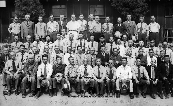 Internees from Kauai at the Santa Fe Internment Camp, New Mexico. Front row, kneeling and seated (L-R): Shinjiro Matayoshi (1st), Kenji Yoshiura (2nd), Ryozo Izutsu (3rd), Kaetsu Furuya (4th), Yukiyasu Sodetani (5th), Koshi Tatsuhara (6th), Tsuruzo Hasegawa (7th), Rev. Hironori Nishii (9th, on chair). Row 2, seated: Mankichi Miura (2nd, without tie), Takeo Seike (3rd), Kameo Tahara, Rev. Kakichi Okamoto (5th), Rev. Hiseki Miyasaki (6th), Rev. Ichiro Uyeda (7th), Yozaemon Yamamoto (8th), Zenzo Kisada (9th), Masaji Toyofuku (4th from R), Chiyomatsu Hamamura (3rd from R), Kazuto Yokota (1st from R). Row 3: Zenkichi Morita (1st), Sukenoshin Nakano (2nd), Kazuto Taketa (3rd), Rev. Shoyu Kitajima (4th), Rev. Gijo Ozawa (5th), Rev. Chiko Odate (6th), Rev. Kakuho Asaoka (7th, wearing hat), Isuke Horikawa (3rd from R), Enichi Saiki (2nd from R), Kyoichi Uyeda (1st from R). Back row: Kyushichi Hayashi (2nd), Kenichi Hataishi (4th), Rev. Kyojo Naitoh (5th), Kokichi Tsuji (6th), Katsutaro Yamasaki (7th), Meijiro Hayashi (3rd from R), Sunao Fujii (2nd from R), Isami Ueoka (1st from R). JCCH/Sunao Fujii Archival Collection.