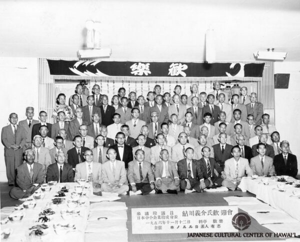 Welcome party for Aikawa Gisuke, founder of Nissan Motor Co., at Kanraku Tea House, Honolulu, 1956. Row 2 (L-R): Tokuichi Tsuji (1st), Totaro Matsui (6th), Taichi Sato (7th), Seiichi Shimamoto (9th). Row 3 (seated; L-R): Soichi Obata (1st), Manzuchi Hashimoto (2nd), Koichi Iida (3rd), Takeo Isomura (5th), Daizo Sumida (8th), Katsuichi Kawamoto (9th), Matsujiro Otani (12th). Row 4 (standing): Kiyoshi Yonemura (7th). JCCH/Seiichi Shimamoto Collection.