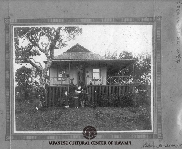Yakichi Watanabe Family in front of family home. Hilo, Hawaii Island, January 1918. Yakichi (holding son), wife Fumiko, and parents. JCCH/Sadako Alison Yamanaka Collection.